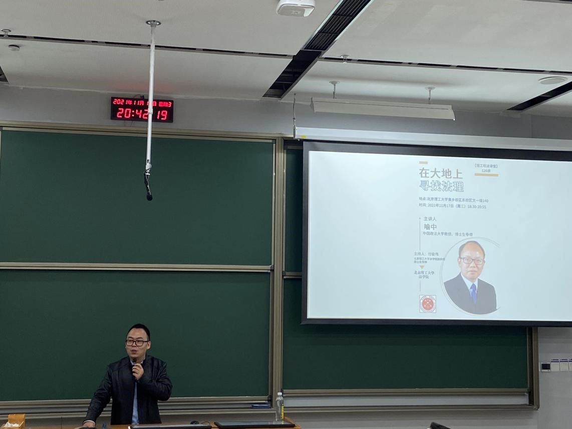 2021年11月17日晚,理公明法课堂第126讲“在大地上寻找法理”在北京理工大学良乡校区东区文一楼140教室成功举办。这是为全日制法学硕士和法律硕士开设的《法学前沿专题》课程在本学期的第九讲。本次课程的主讲人是中国政法大学教授、博士生导师喻中老师。主持人为北京理工大学国际争端预防和解决研究院副院长付俊伟副教授。