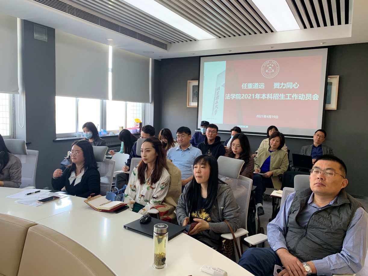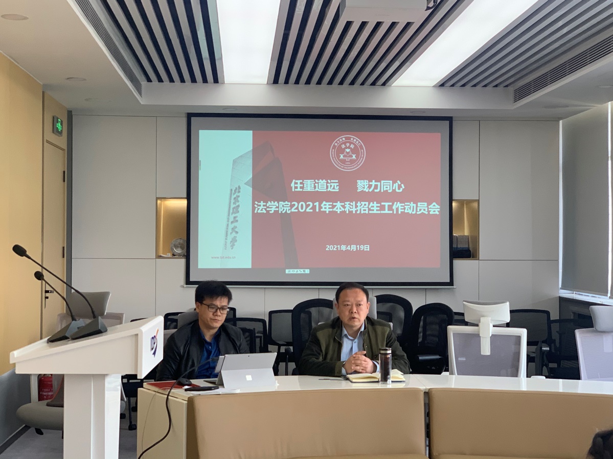 为进一步加强招生工作的工作成效,提升本科生源质量,助力学校“双一流”建设,2021年4月19日上午,北京理工大学法学院在中关村校区国争院会议室召开了以“任重道远 勠力同心”为主题的2021年本科招生工作动员会,对甘肃省、青海省招生宣传工作进行动员和部署。法学院党委书记张瑜,党委副书记、副院长马晓龙,以及学院部分领航人参加了此次会议。