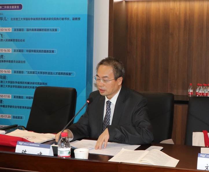 围绕国际商事调解法律问题,中国社会科学院国际法研究所国际经济法室主任、北京理工大学国际争端预防和解决研究院专家咨询委员会委员刘敬东教授分享了新加坡调解公约的签署和落地所涉及的三大问题以及中国加入CPTPP可能面临的挑战。北京理工大学国际争端预防和解决研究院执行院长杨成铭教授对于“防止国有企业采用国际商事调解可能导致国有资产流失风险的办法”提出了若干创新观点。司法部人民参与和促进法治局调解处处长熊飞根据我国商事调解的现状,面临的问题、困境,从顶层设计、商事调解组织性质、商事调解协议效力、商事调解制度机制以及商事调解收费问题六个方面总结提出了我国当前商事调解存在的困难和问题。
