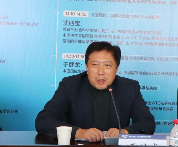 中国国际贸易促进委员会秘书长、中国国际商会执行副会长兼秘书长、国际商事争端预防和解决组织理事长、北京理工大学国际争端预防和解决研究院专家咨询委员会副主任委员于健龙先生针做了题为“区域全面经济伙伴关系协定(RCEP)与中国经贸的发展”的报告,概括了RCEP的十大亮点和三个重大意义。